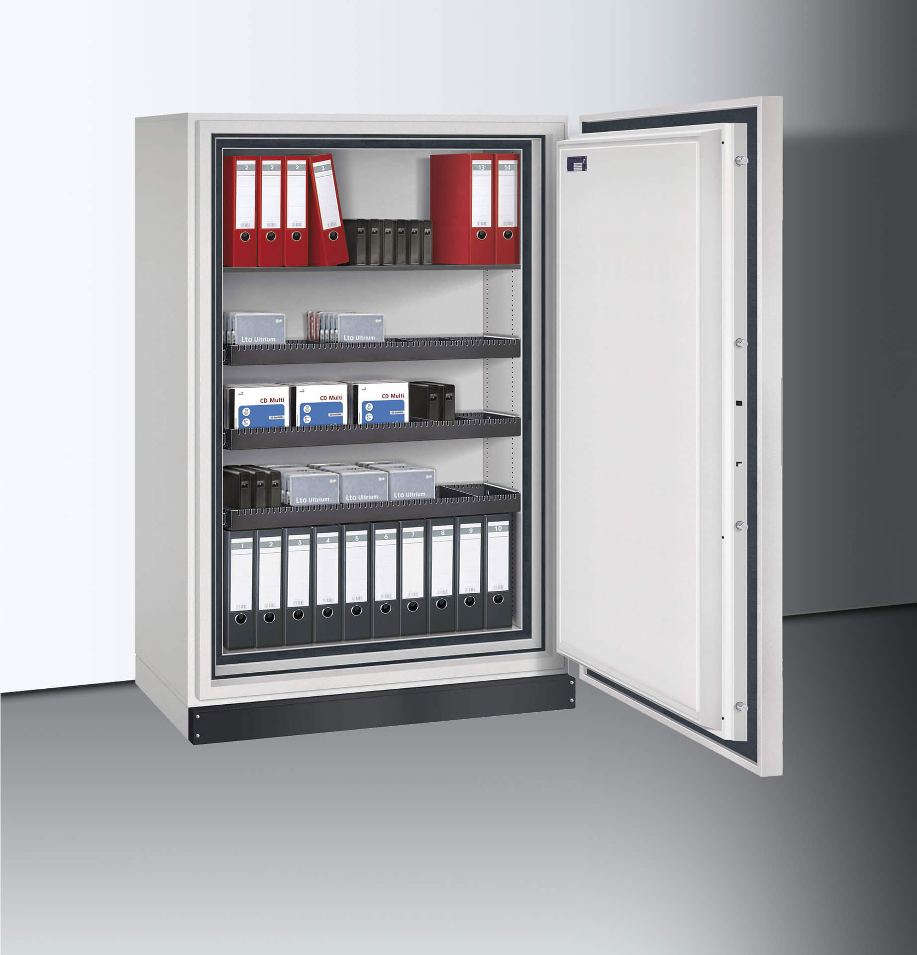 Höchster Brandschutz auch für magnetische Datenträger sowie einen leichten Einbruchschutz sind die Kennzeichen unsere Basisserie S. Der Korpus und die Tür bestehen aus mehrwandigem Stahl, der mit einer Spezialbetonfüllung versehen ist. Massive Riegebolzen und eine Notverriegelung sichern den Inhalt, der zudem für 120 Minuten Feuer, Löschwasser und Brandgasen geschützt ist. Optional erhältlich sind sowohl Innenausstattung als auch Öffnungsvarianten. Zu Sonderlackierungen oder weiteren individuellen Wünschen beraten wir sie gern und unverbindlich.