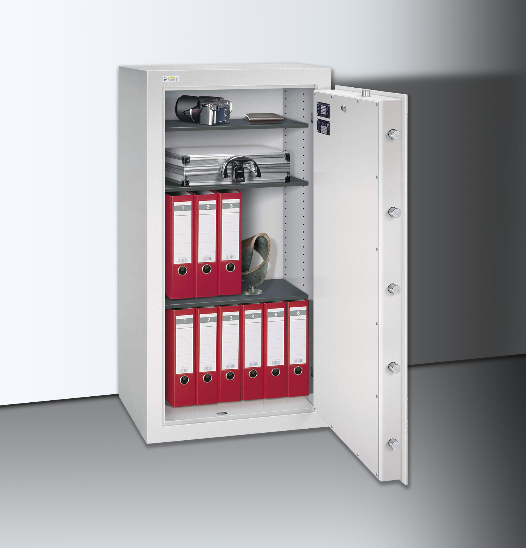 Die Basisserie bietet bereits gute Sicherheit gegen Einbruch und leichten Brand. Durch die Füllung mit Spezialbeton im zweiwandigen Korpus werden Einbruchversuche, auch mit schwerem Gerät, für kurze Zeit verhindert. Die glatte Außenseite des Tresors bietet keine Angriffspunkte für Brecheisen und massive Stahlbolzen machen ein Aufhebeln bei durchtrennten Scharnierbändern unmöglich. Für den Schutz vor leichtem Feuer sorgt eine umlaufende Feuerfalz. Eine Spezialpanzerung im Verschlussbereich komplettiert die Modelle dieser Serie mit dem säurebeständigen Doppelbartschloss. Zu Sonderlackierungen oder weiteren individuellen Wünschen beraten wir sie gern und unverbindlich.